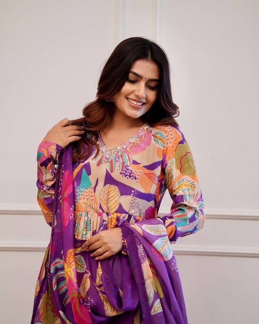 Purple Color Blooming Fabric with Embroidery Work Gown Set.