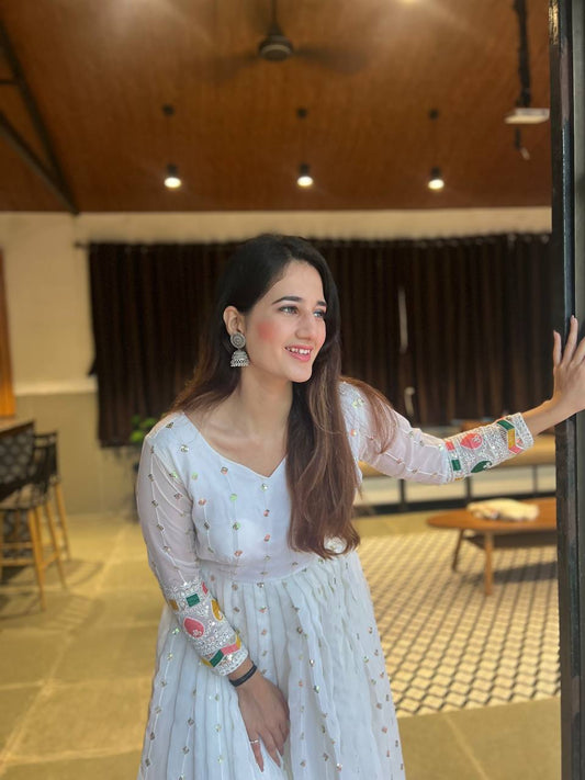 White Color Viscose Fabric With Sequence Embroidery Work Kurta Set.