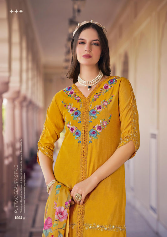 Yellow Kurti in Embroidery Work And Hand Work On Vicitra Silk.