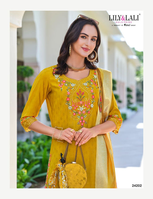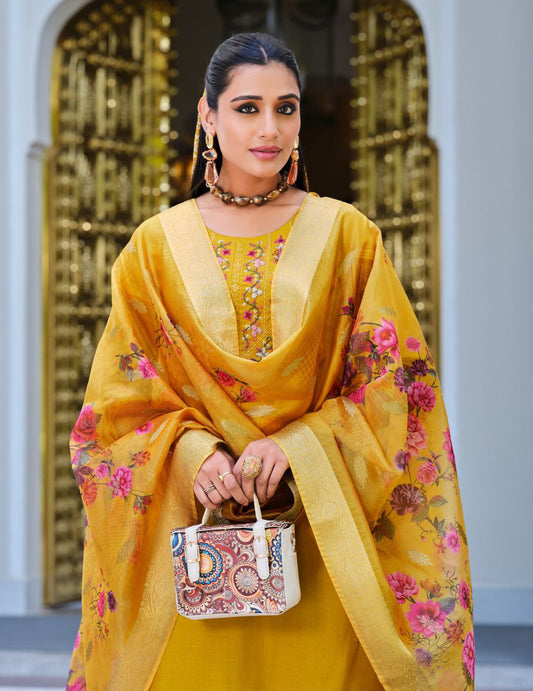 Yellow Kurtie with Pant & Dupatta in Blooming Jorjat With Work .