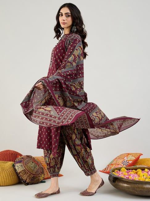 Floral Printed Sequinned Pure Cotton Anarkali Kurta With Palazzos & Dupatta