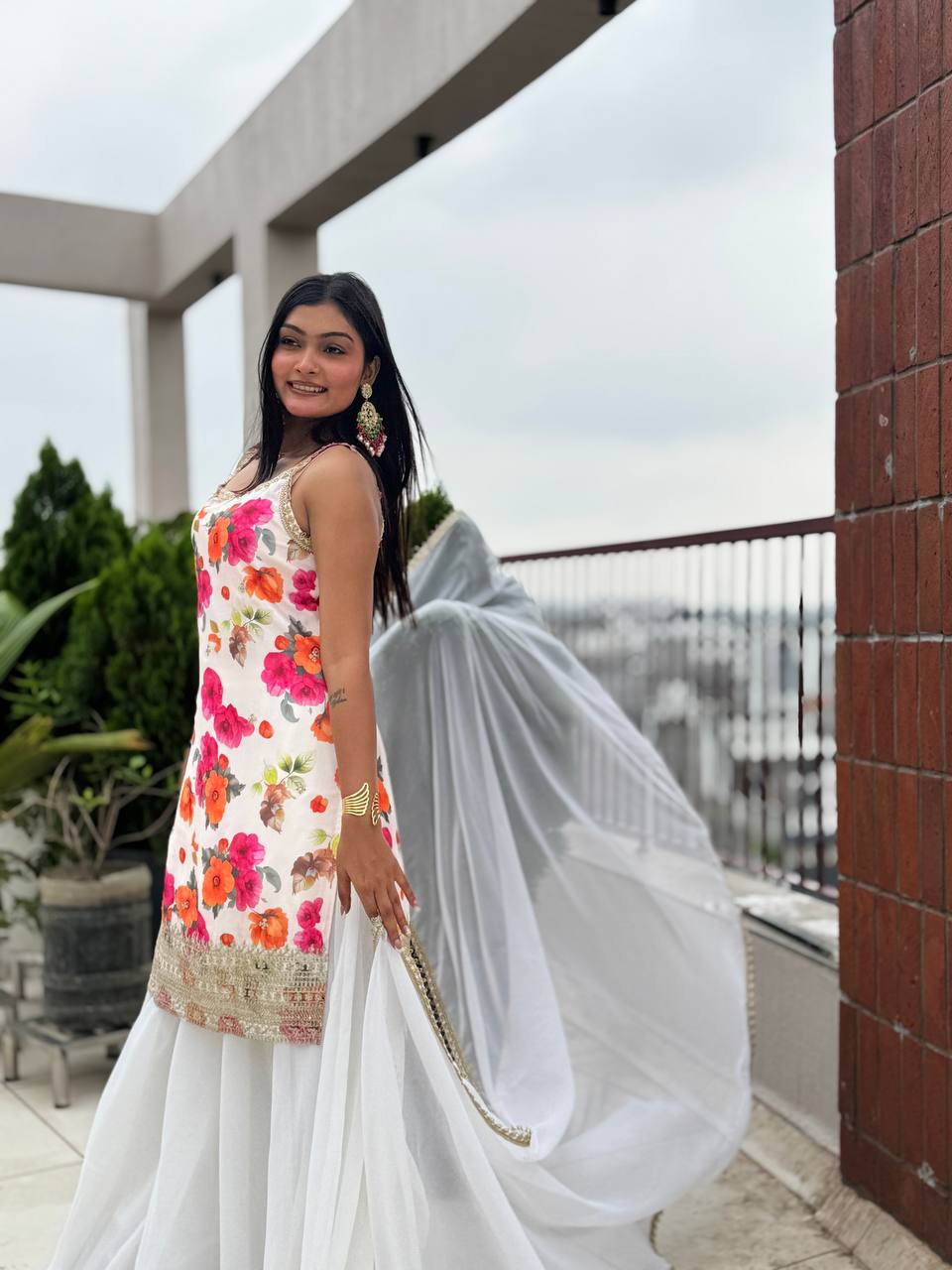 Exclusive White Chinon Silk Kurti with Flared Plazzo and Lace Dupatta