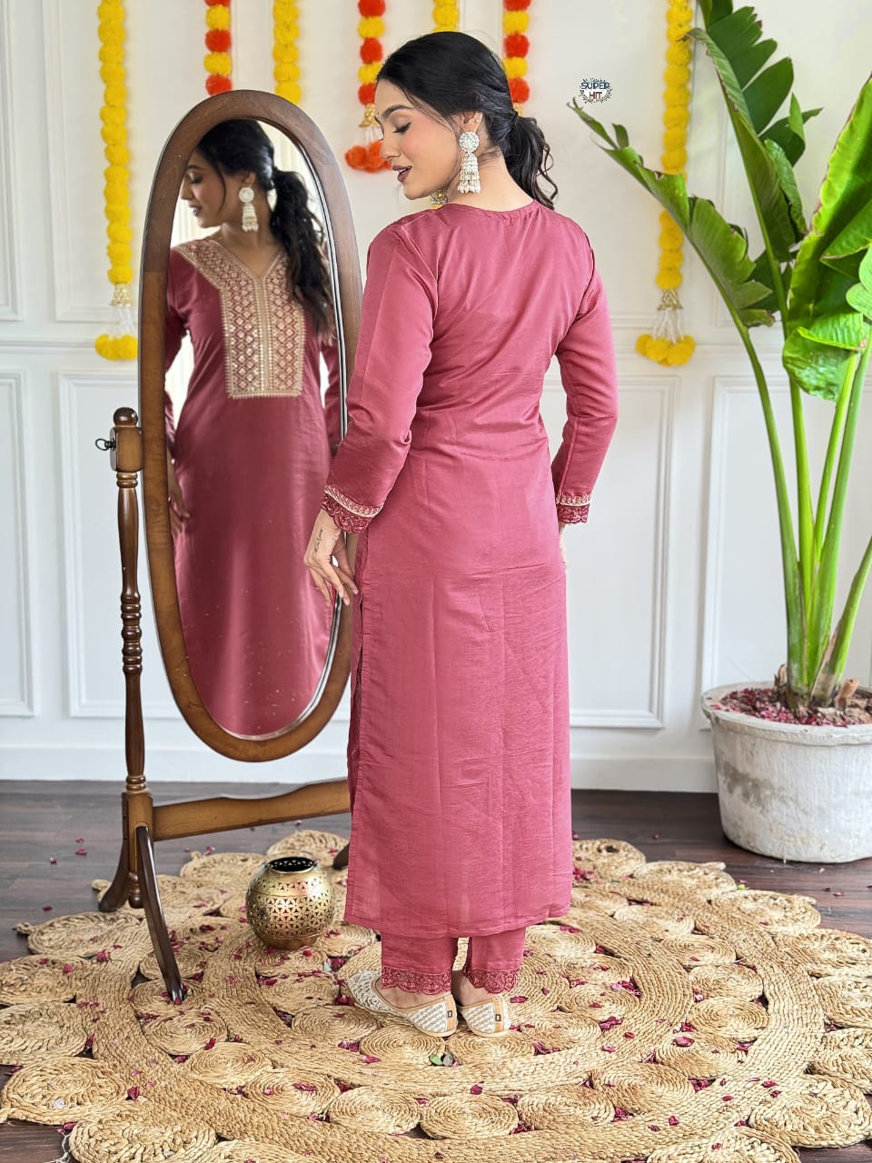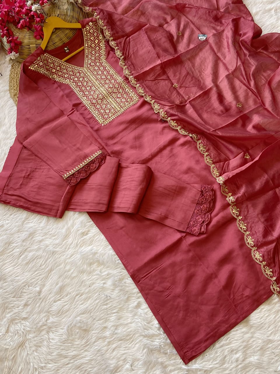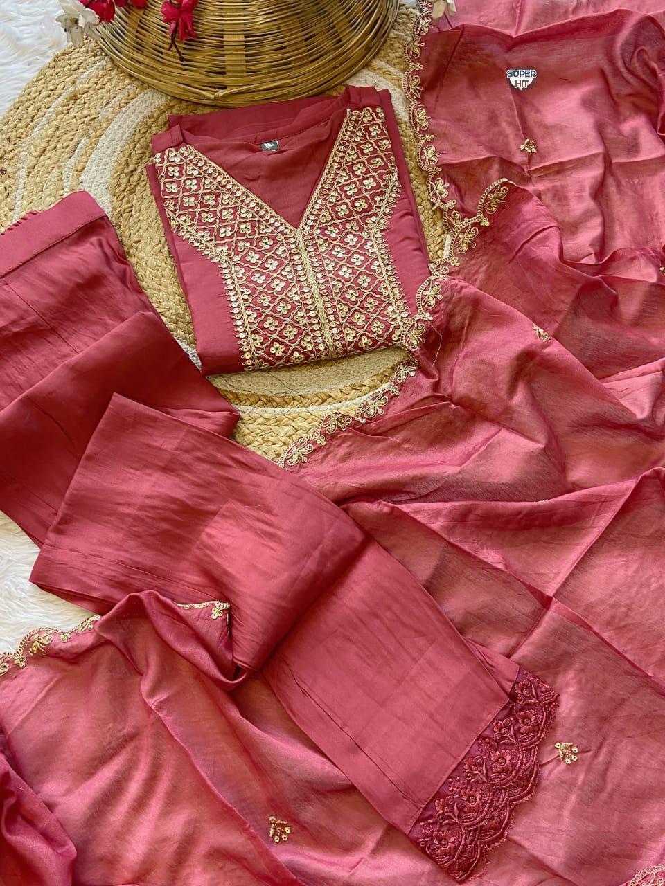 Featuring beautiful Heavy Suit Set which is beautifully decorated with intricate hand embroidery, Zari weaving . It is paired with matching pants and Lace Dupatta.